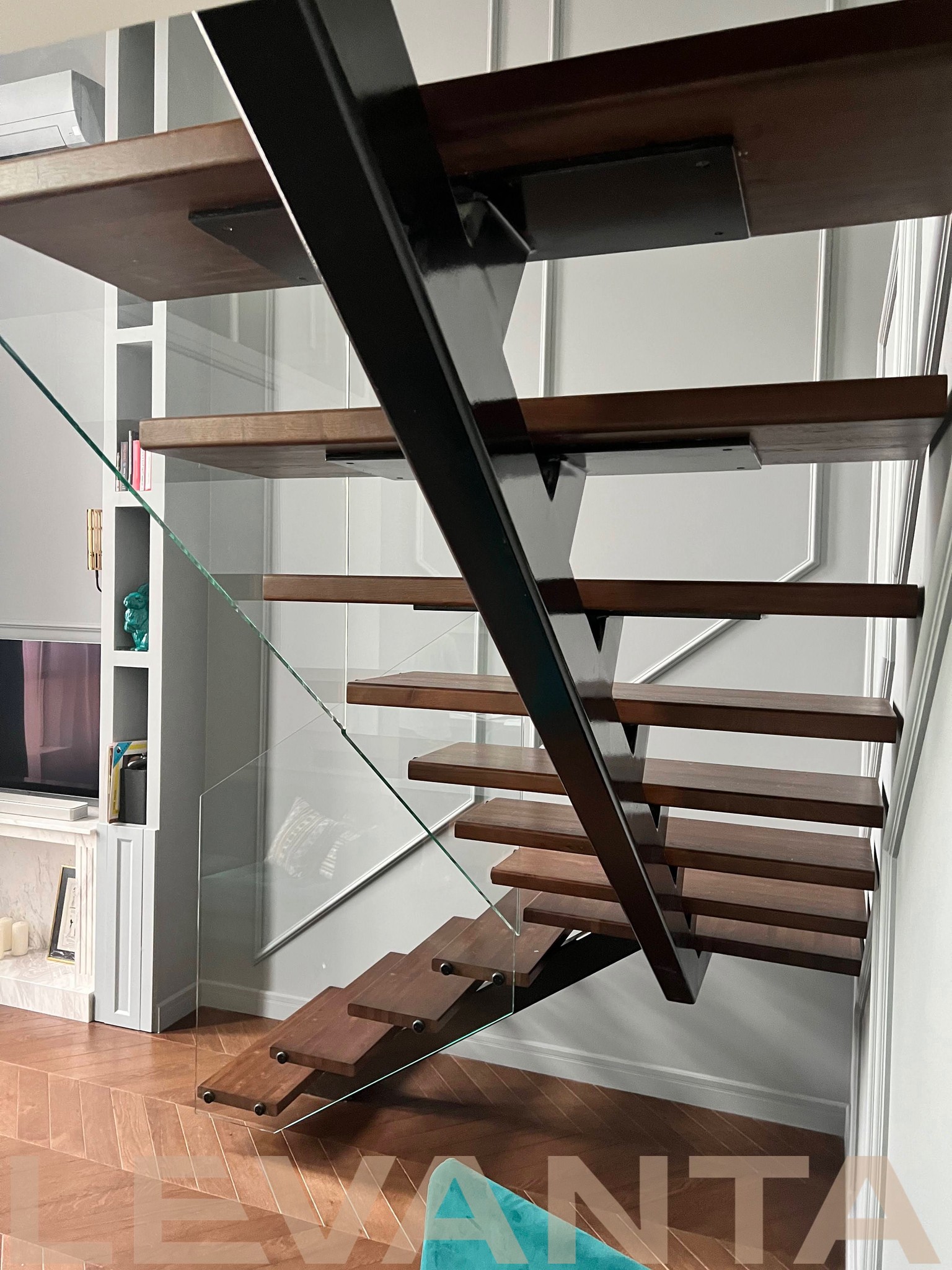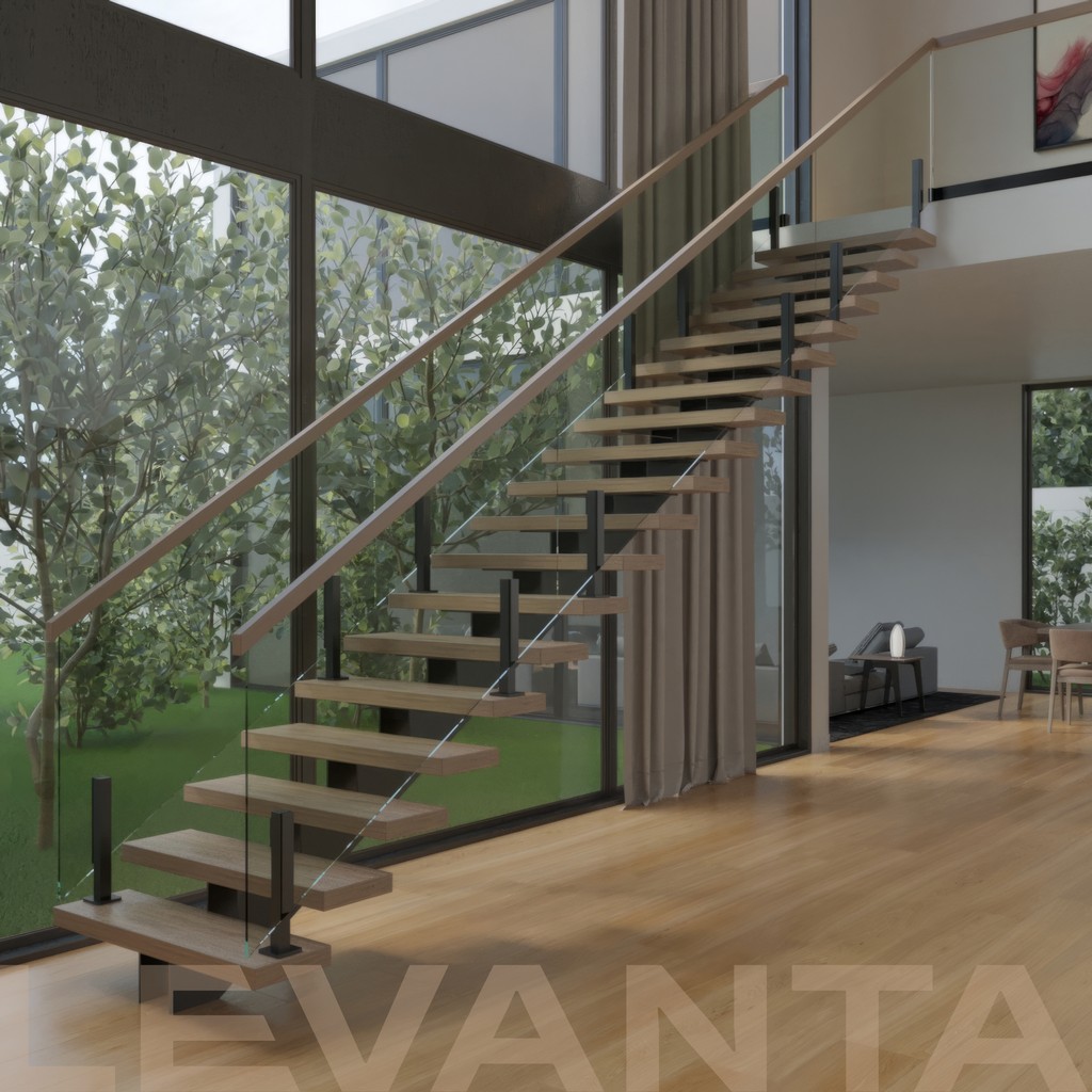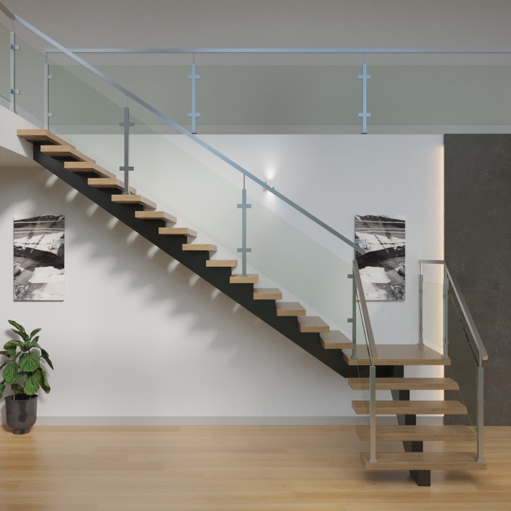 Металлический каркас обшит деревом, стеклянные ограждения крепятся в торец ступени. Выглядит современно и визуально облегчает пространство.
