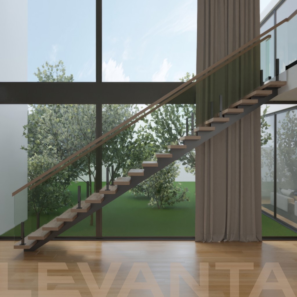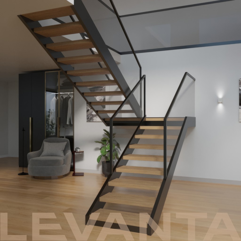 Современная лестница на металлическом монокосоуре из профильной трубы. Лёгкая и прочная конструкция с центральной несущей балкой под ступенями.